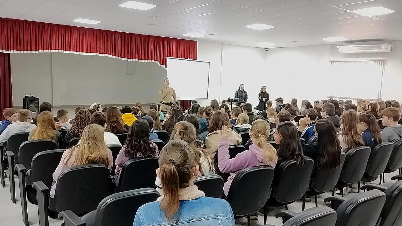 Na manhã desta terça-feira (16), os alunos do 6º ao 9º ano do ensino fundamental do Centro Educacional Vereador Raymundo Veit, em Maravilha, participaram de uma palestra ministrada pelo instrutor do Proerd, sargento Dalla Corte.