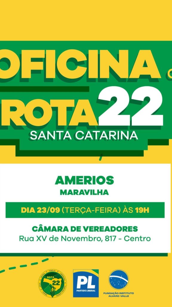 Na próxima terça-feira, dia 23 de setembro, o município de Maravilha será palco de mais uma edição da Oficina do Rota 22, iniciativa que percorre diversas cidades catarinenses levando debates e capacitação política. O encontro será realizado na Câmara de Vereadores, a partir das 19h, e conta com a organização da Amerios (Associação de Municípios do Entre Rios) em parceria com o Partido Liberal (PL) e a Fundação Instituto Álvaro Valle.