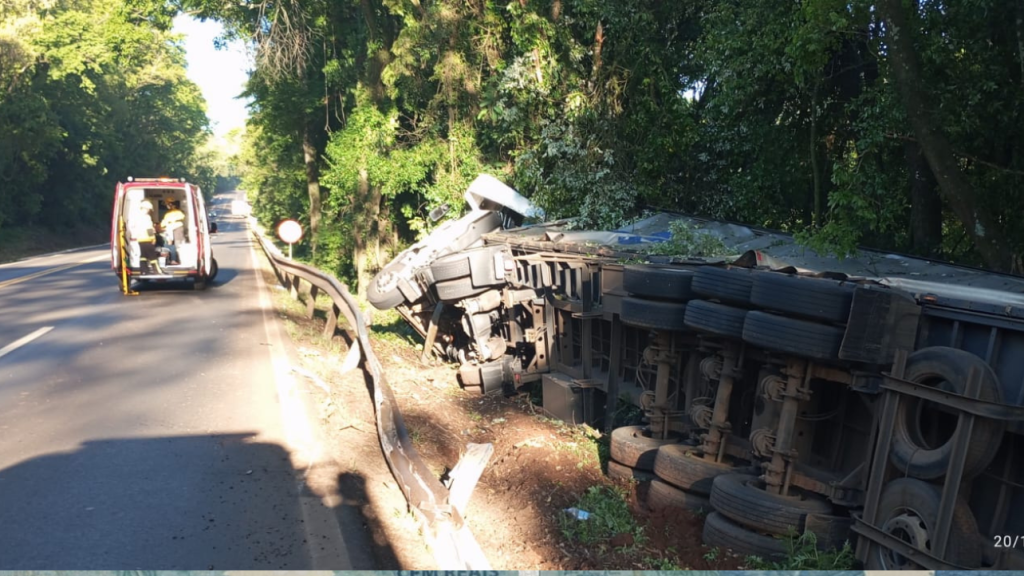 No local, os bombeiros confirmaram que se tratava de uma carreta Volkswagen, com placas padrão Mercosul, carregada com papelão, que acabou saindo da pista e ficou presa em um barranco, sustentada por uma árvore.