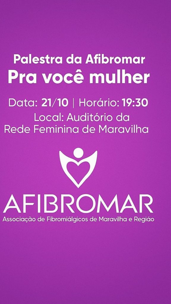 A Associação de Fibromiálgicos de Maravilha e Região — Afibromar — promove na noite desta terça-feira, dia 21 de outubro, uma palestra especialmente voltada para o público feminino, com o tema “Pra você, mulher”. O encontro será realizado no auditório da Rede Feminina de Maravilha, a partir das 19h30.